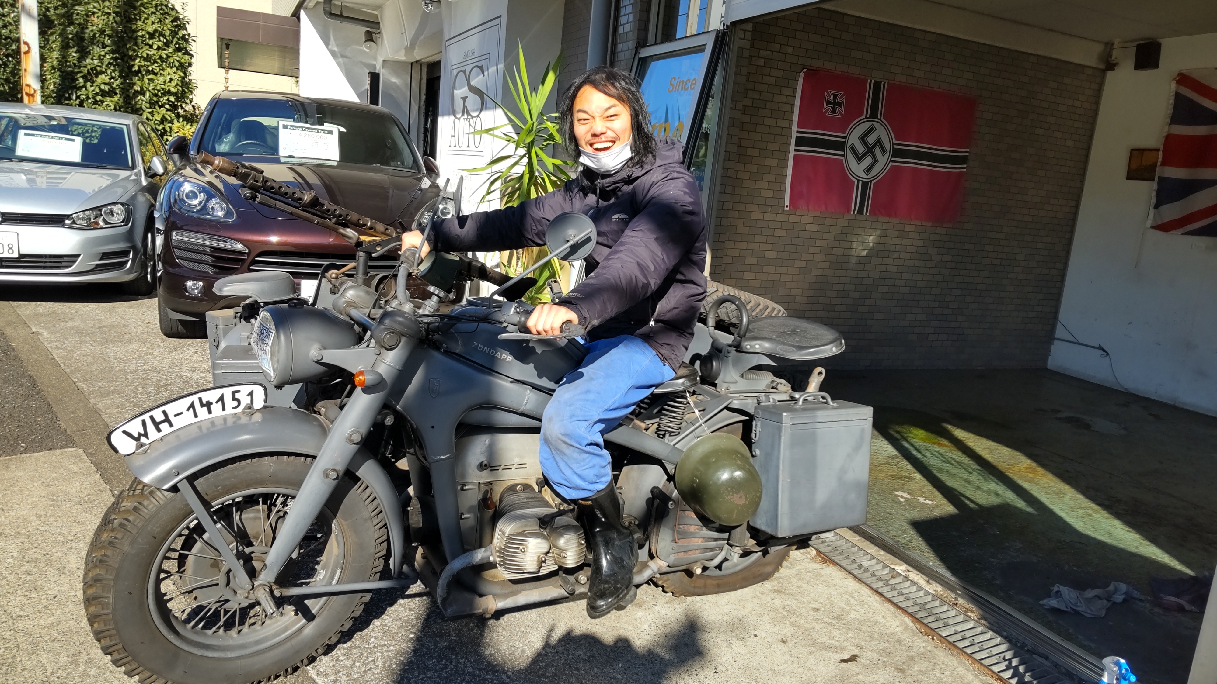 ちょこちょこブログに登場するヴィンテージバイクショップ【TIME TUNNEL】の大掃除で、第二次大戦ドイツ軍用車のZUNDAPP KS750(あだ名は「戦車」)を外に出す機会があったから、またがっちゃいました。 後ろにはハーケンクロイツが。。