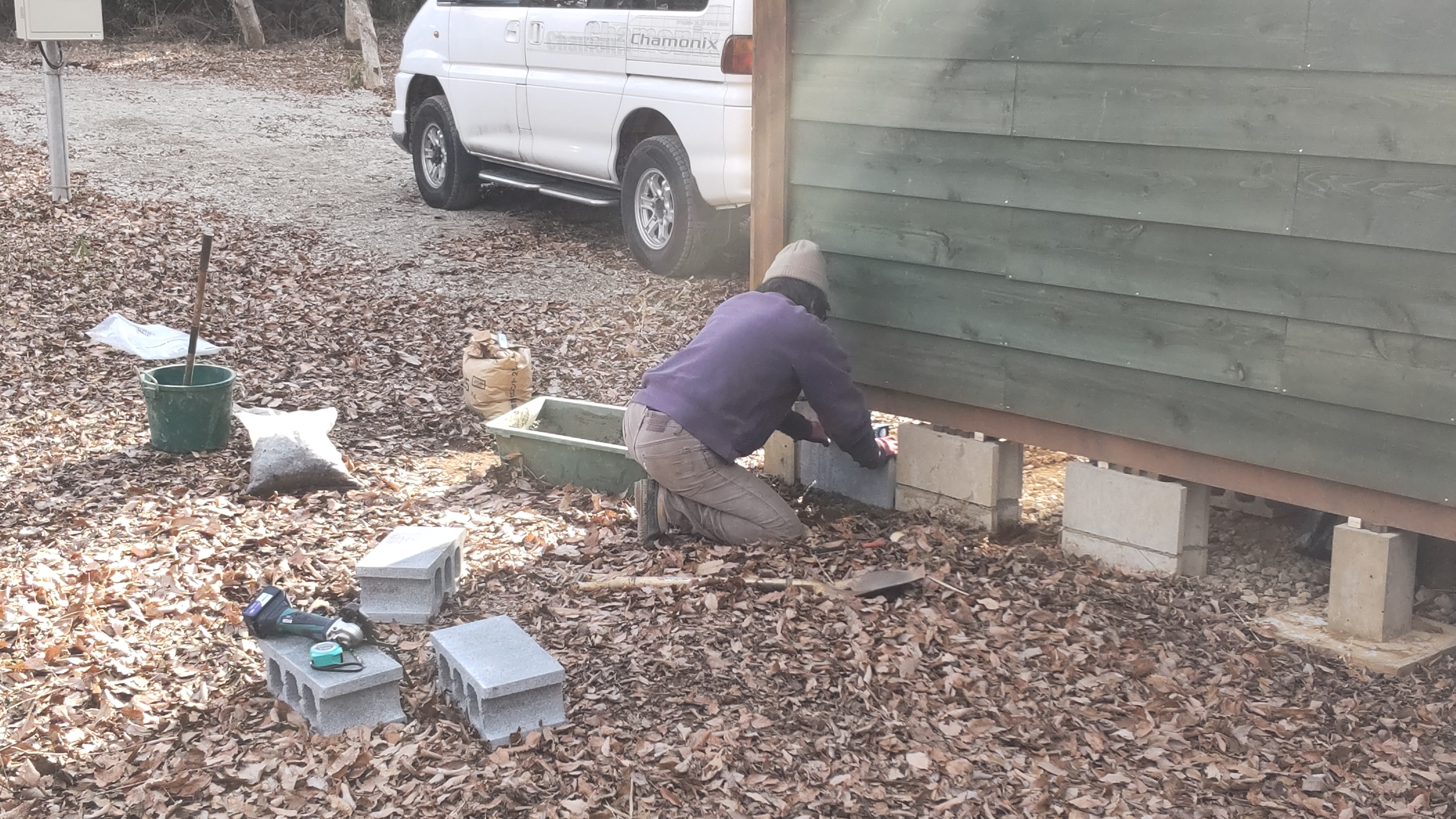 また、基礎間の隙間埋め(コンクリートブロックをスペースの大きさに合わせて切り分けてはめ込み、モルタルで固定する)がまぁまぁ進行した。