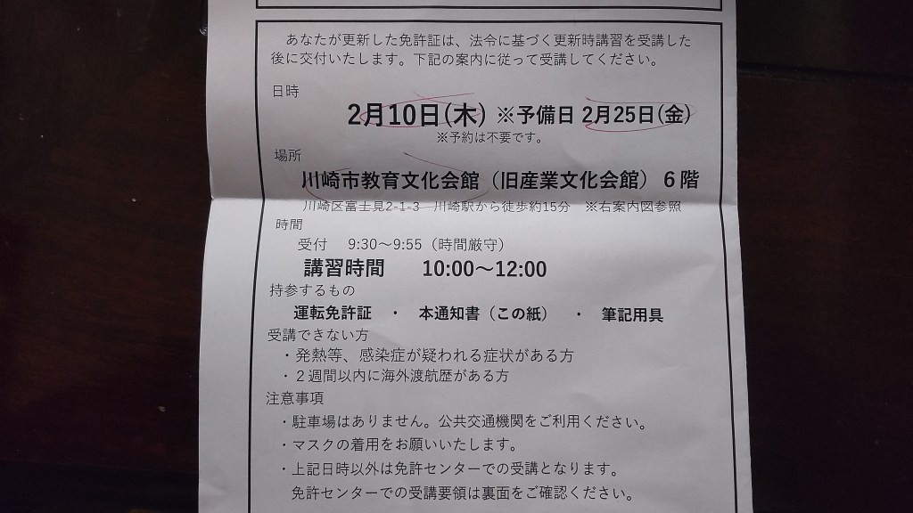 そしてこの紙をもらったのだが、「2週間以内に海外渡航歴がある方」は受講できないとのこと。もちろんまだその予定は無いが、海外行ってたら免許の更新もできない世の中になってるなんて、そんな状況早く終わらないかなぁ。