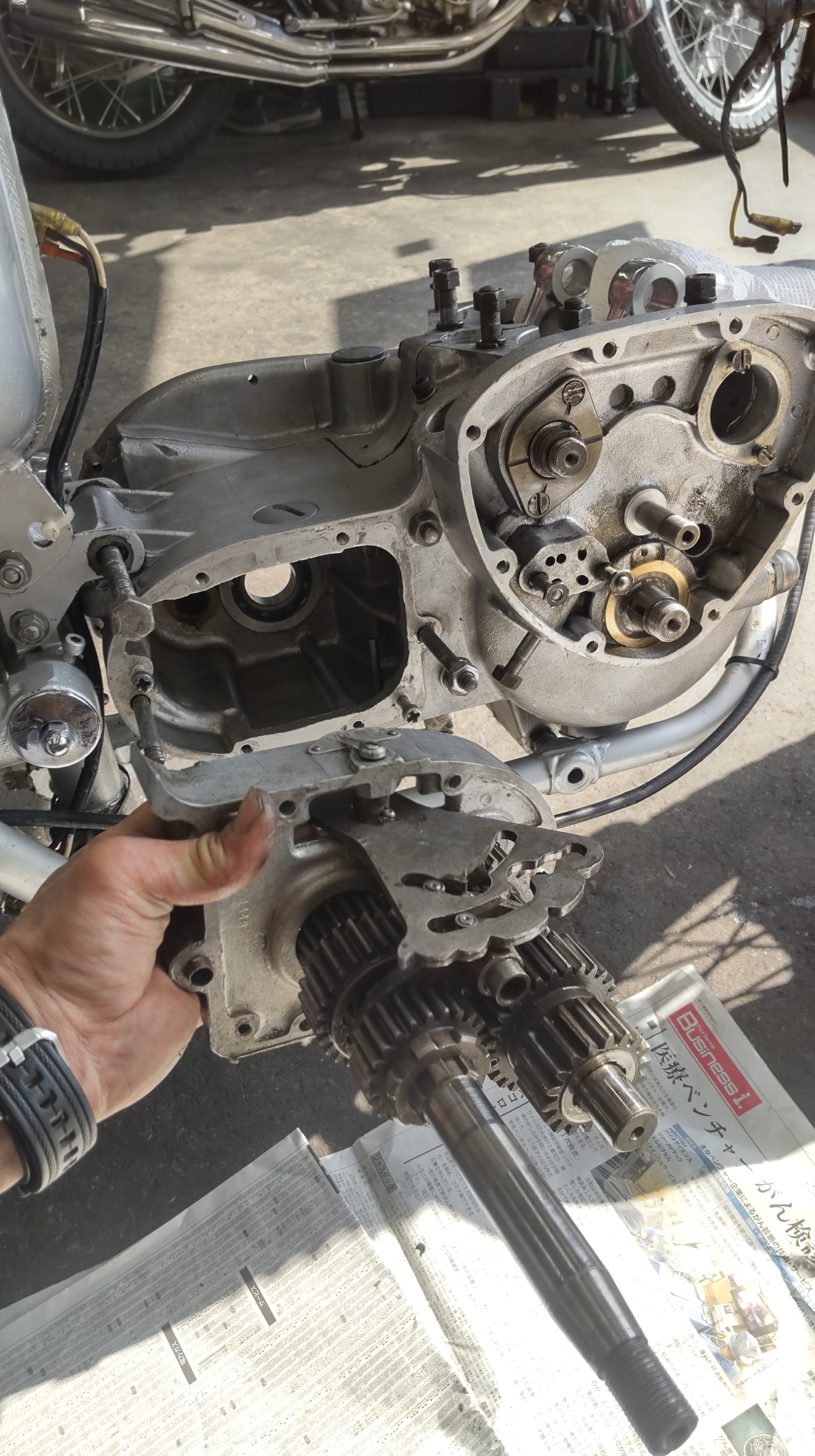今日はトライアンフ5TAにトランスミッション(ギアボックスともいう)を装着し、復活に向けまた一歩前進!👣