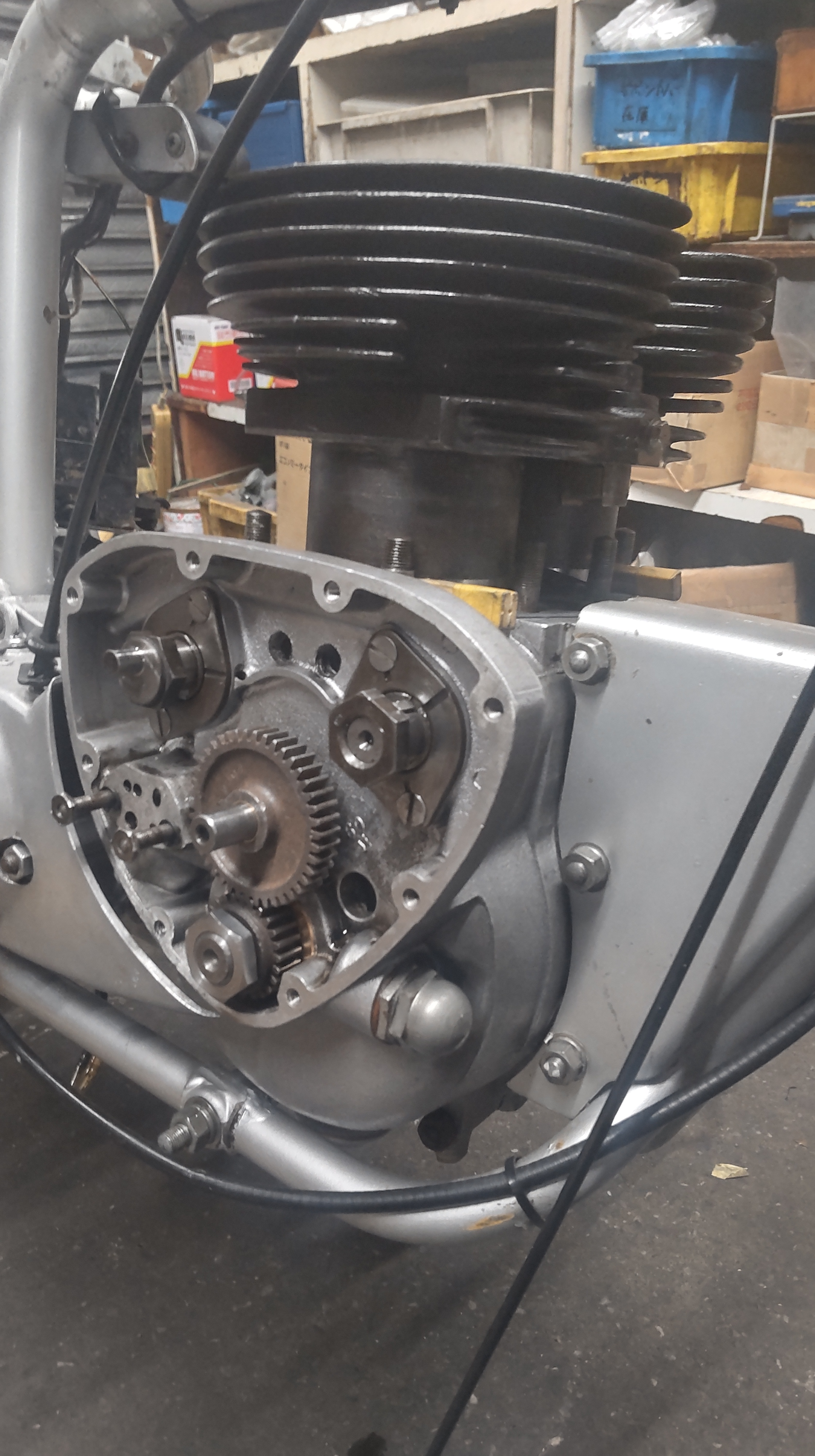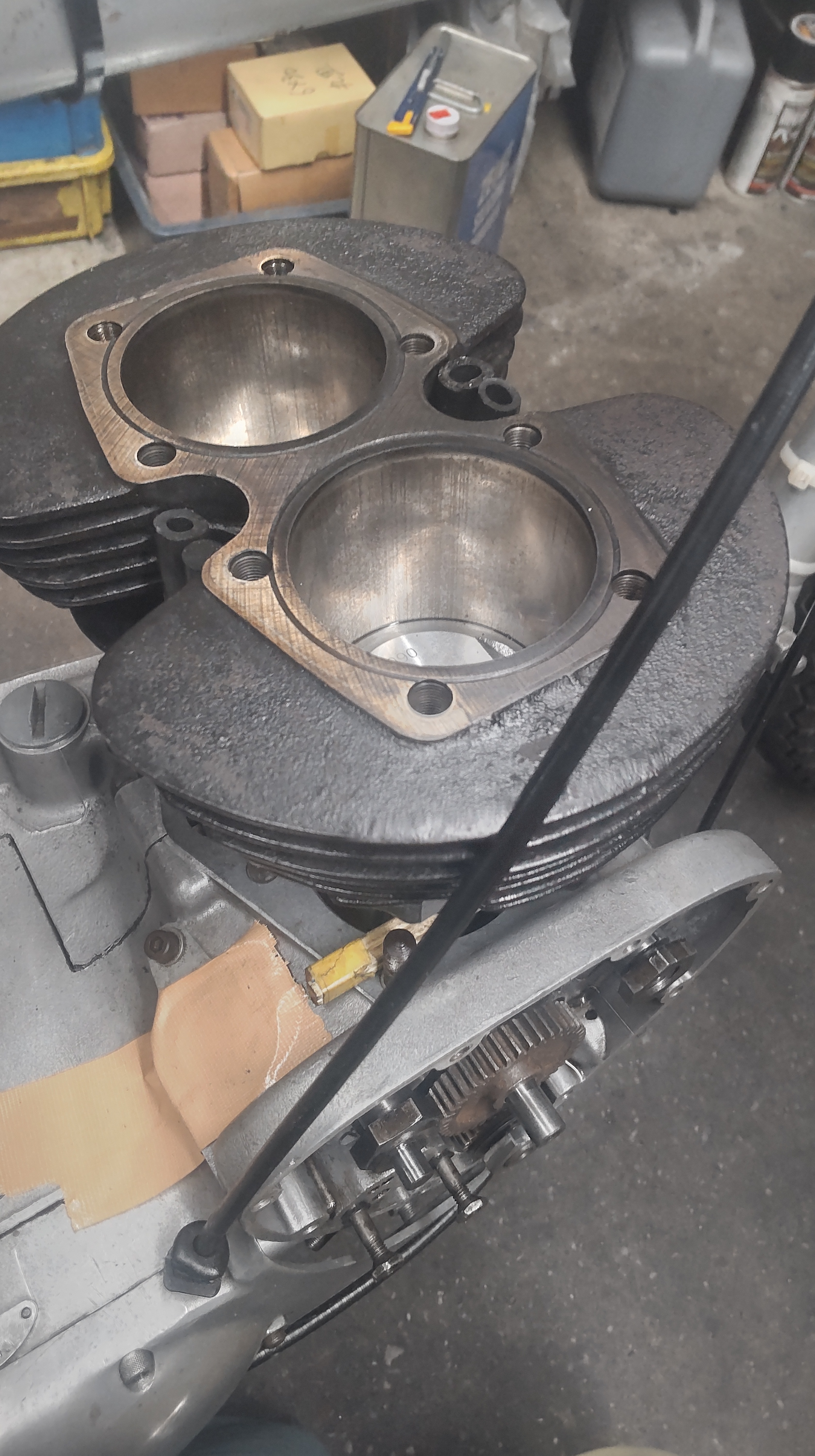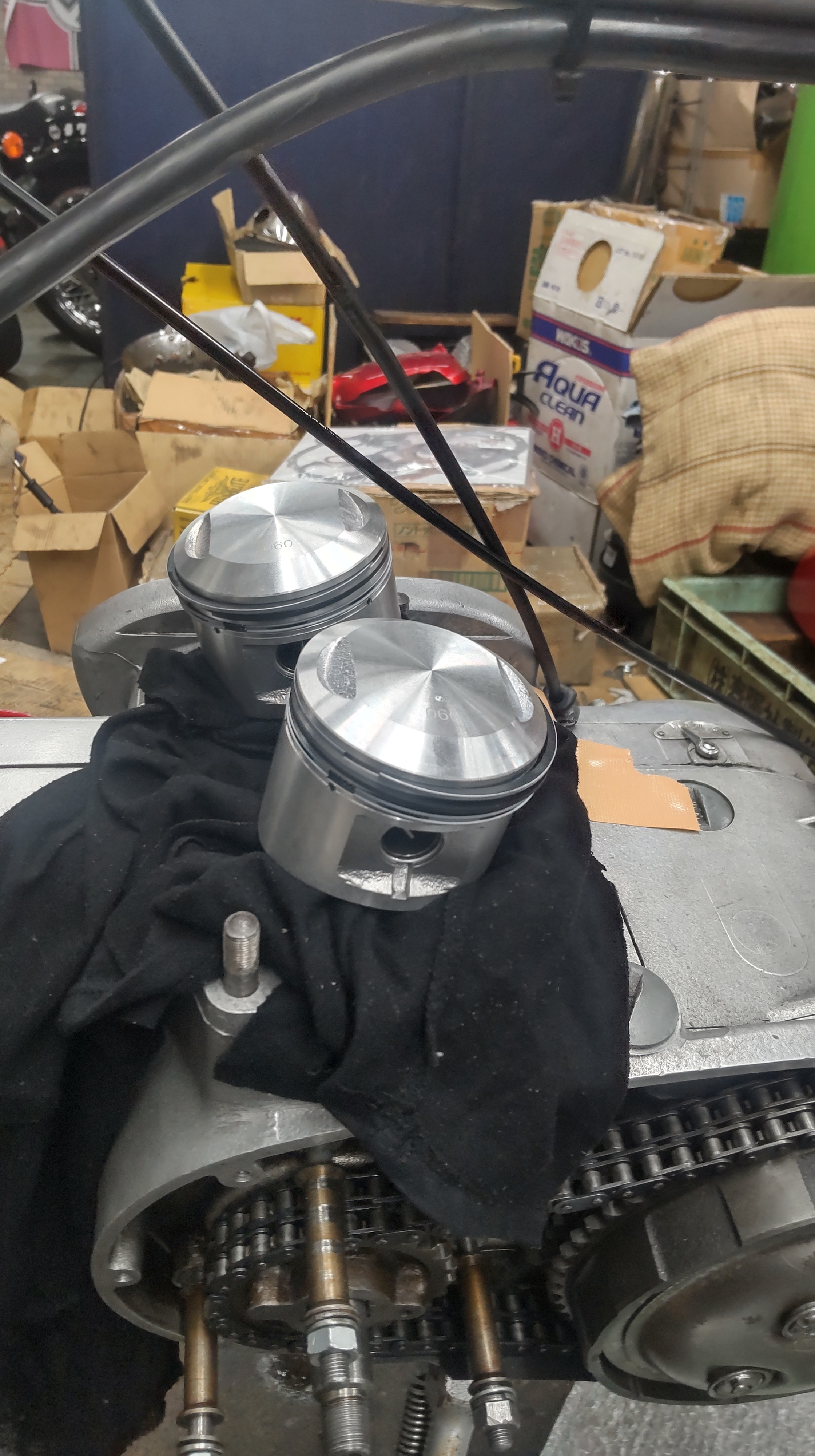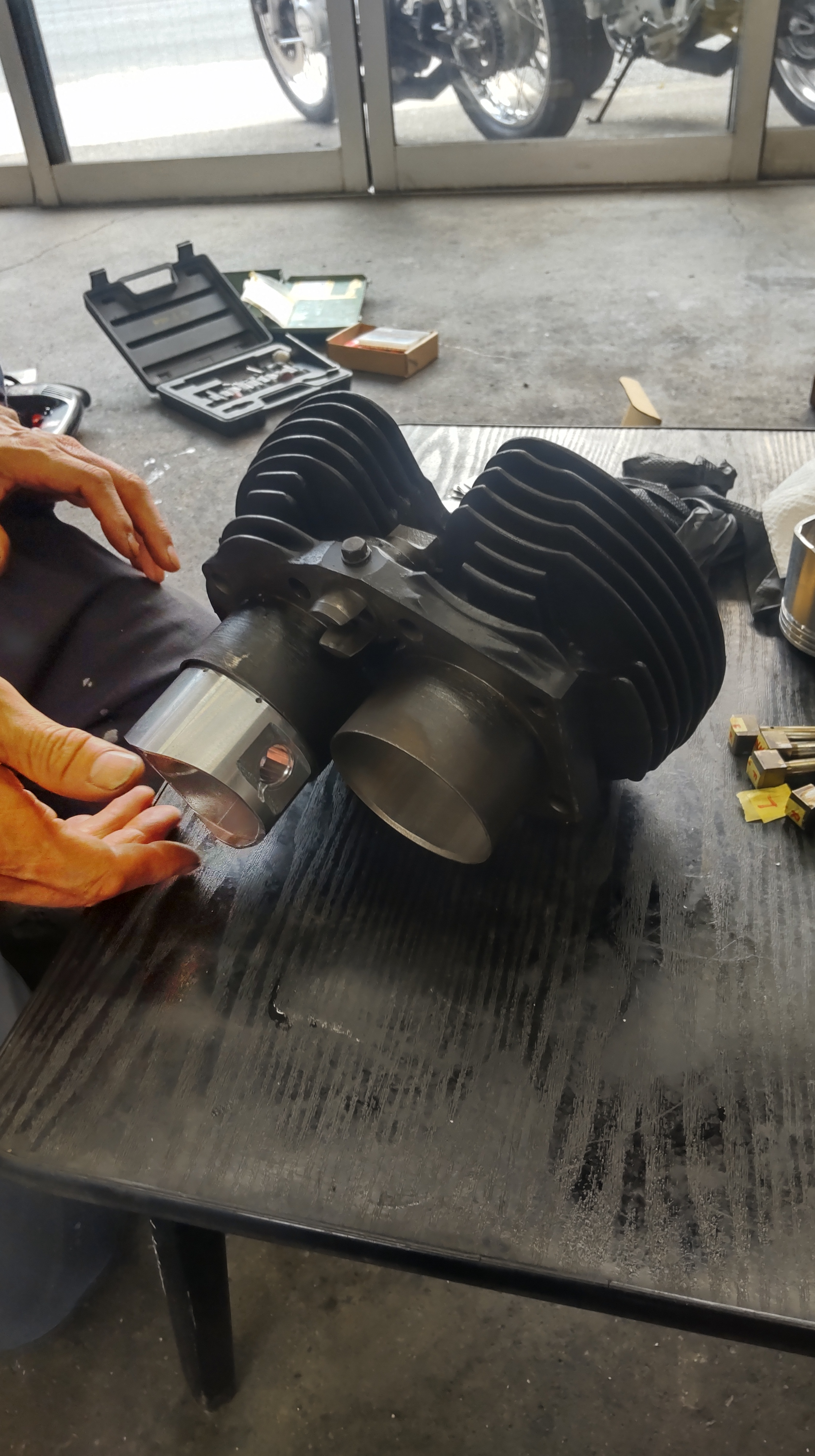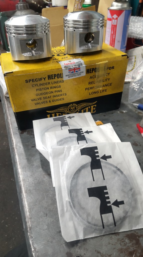結局ピストンも交換することにし、先日イギリスから届いた。右上がもともとのピストン、すでにスタンダードよりも+060インチ大きいサイズが入っていて、これ以上オーバーサイズのものは残念ながら存在しないから、同じく+060の新品を入れる。これまで何度も何度も腰上をオーバーホールしながら使われてきた証拠だ。それに合わせて左上のシリンダーもすでに限界サイズまで拡張されているので、状態が悪くなかったのでそのまま使用することにした。