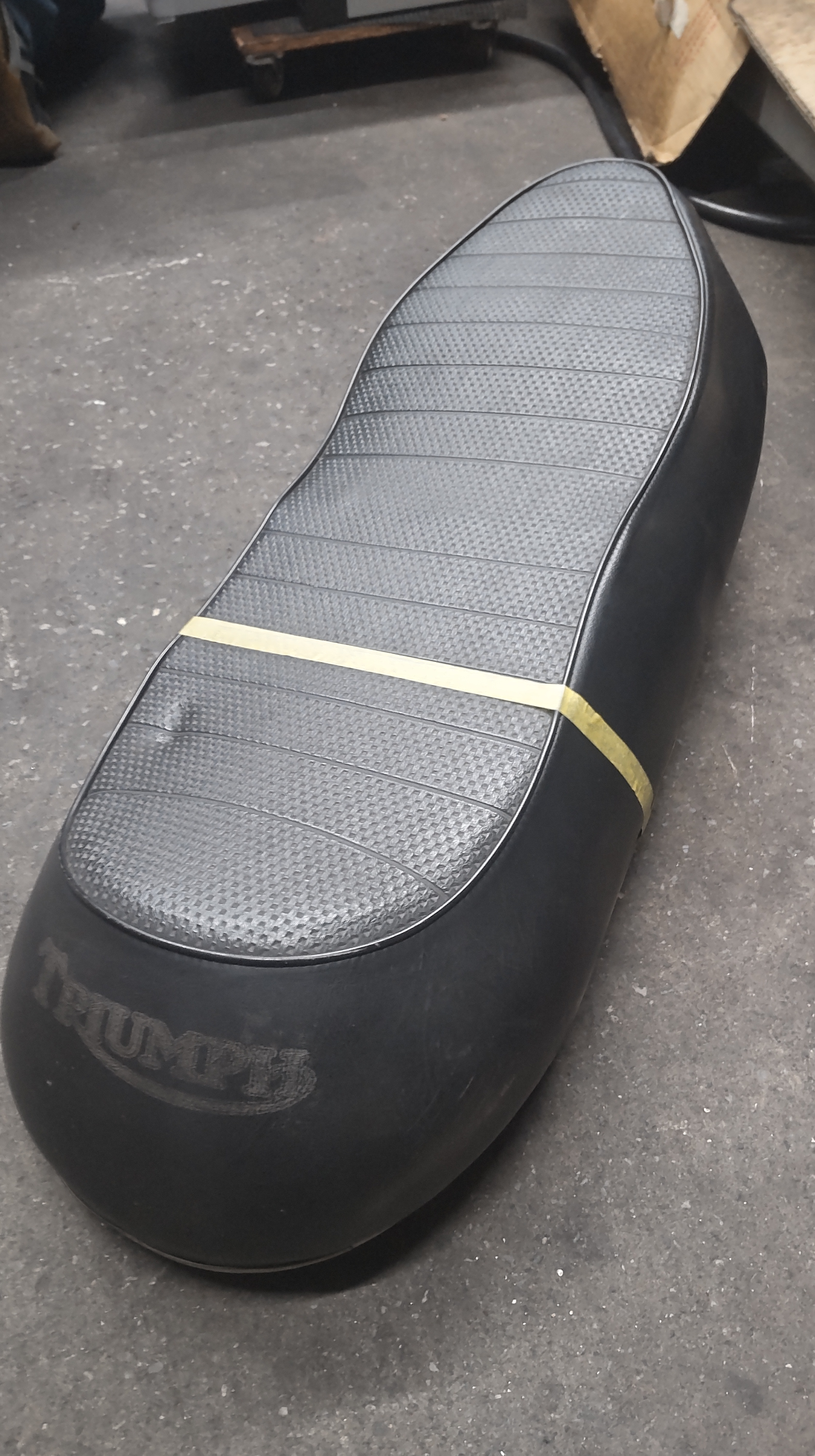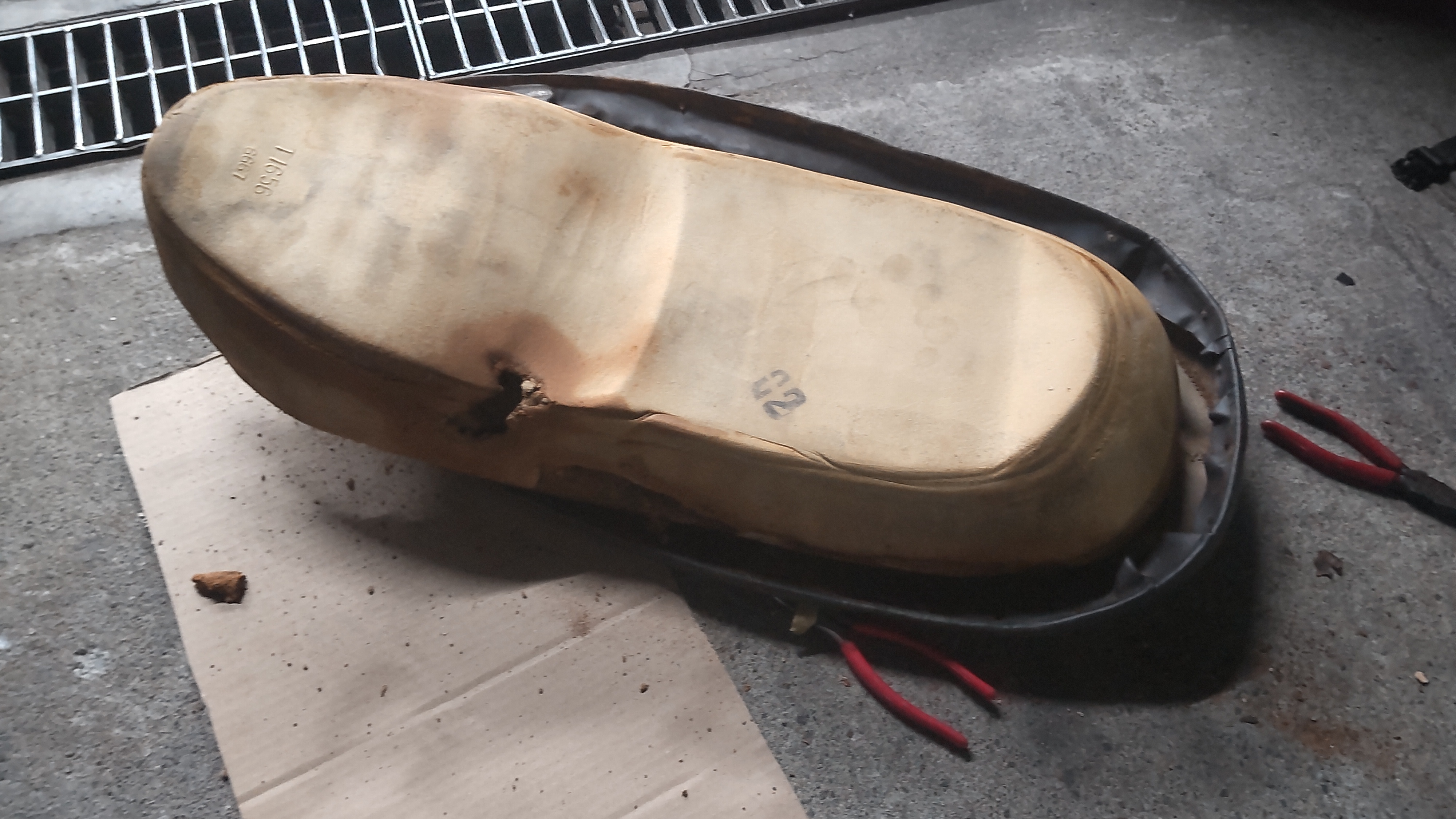 シート制作にも着手。店長の好意でタダでくれたT100Rの純正シートをカットして、自分好みのシングルシートを作る計画だ。