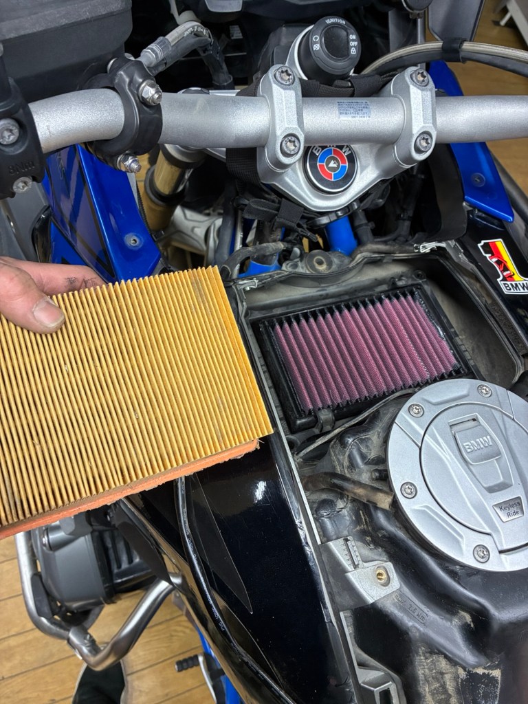 エアクリ交換。使い捨ての純正フィルターから、洗浄とオイル塗布で繰り返し使え、吸い込みも良いK&Nに替える。はじめて替えた1200GSのエアクリーナーはXT1200Zスーパーテネレよりも小さめだった