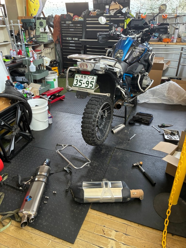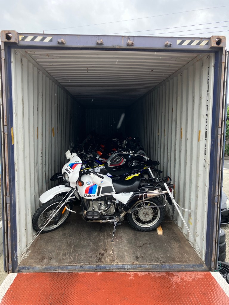 こんな感じでコンテナにバイクを入れたんだけど、とある他人のR1200GSを俺が代わりにわずか10mほど動かした時に、鈍感な俺ですら明らかに自分の同じバイクよりもレスポンスが良いことがわかり、そのフィーリングがずっと体に残っていた。本人に元気な理由を聞いたら吸排気に手を入れているということだった。