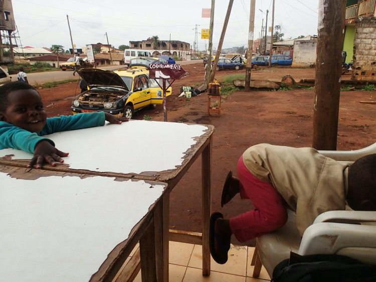 (食堂のテーブルで遊ぶカメルーンのこども)