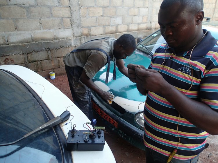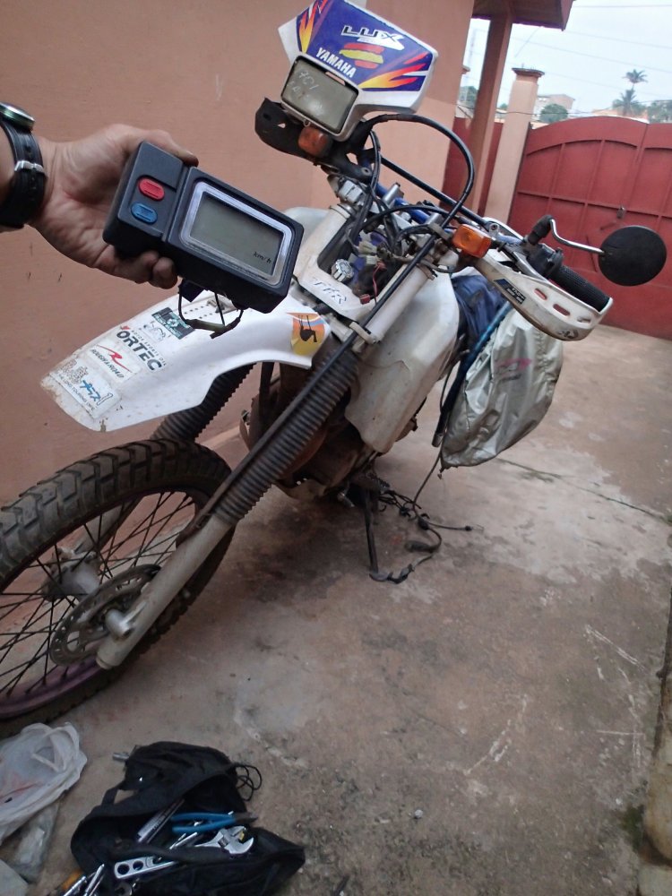 夜間にスーパー豪雨が降った翌朝の21日、キーをONにしてもスピードメーターが点灯しない。そのまま首都のYaounde(ヤウンデ)まで走り、外して確認してみるハーネスの一本がショートして切れていた。コネクター内のギボシから交換しないとダメだろうな。ヘッドライトやメーターを取り外して無防備な間に豪雨が降っても大丈夫なよう、何か防御できるものを探した末に、イスをかぶせておく笑