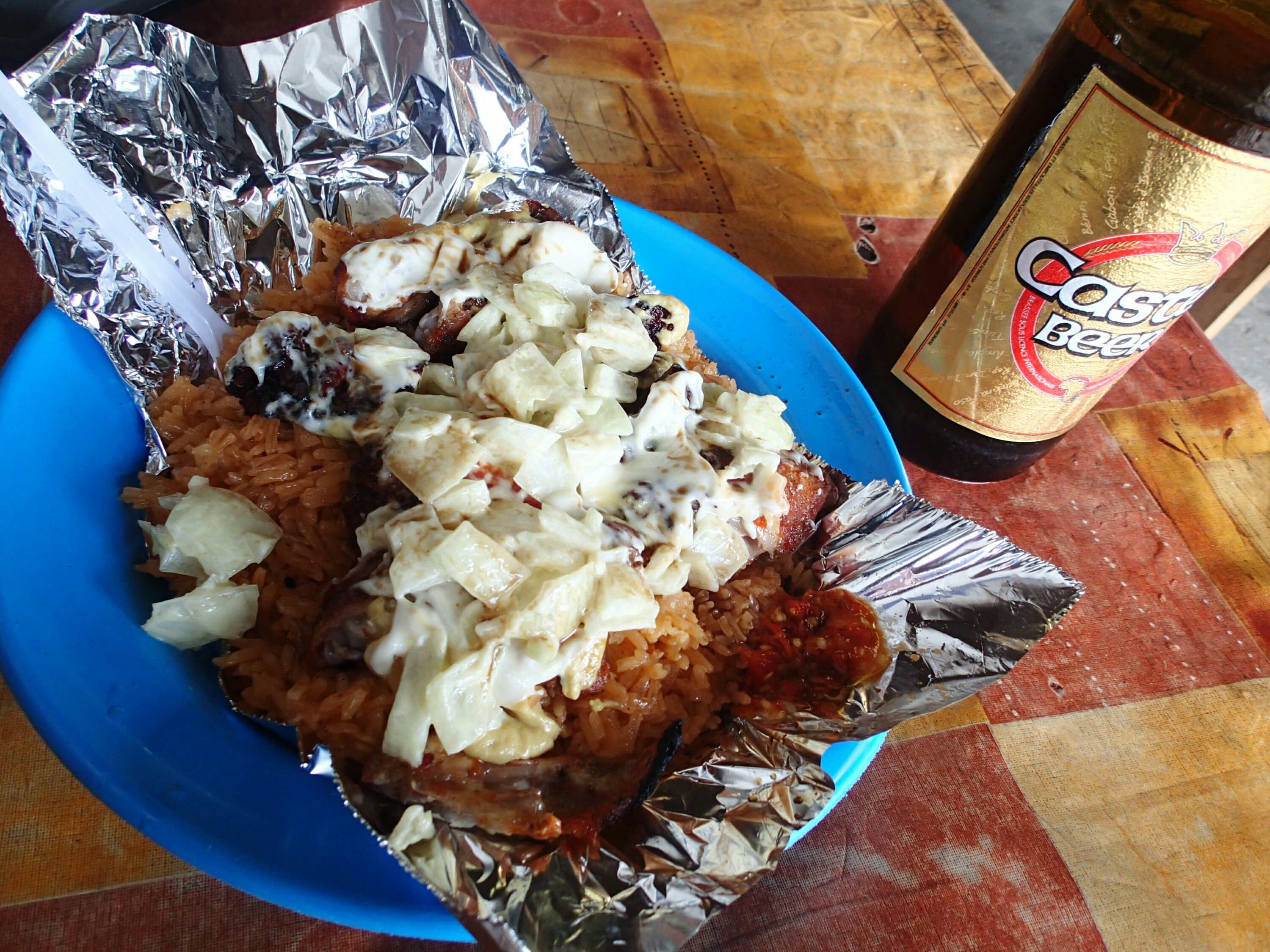 わかりづらいけど、味付きご飯の上に二種類の焼き鳥肉が乗っていて、玉ねぎマヨネーズソースがかかったガッツリめし。1000CFA(約200円)