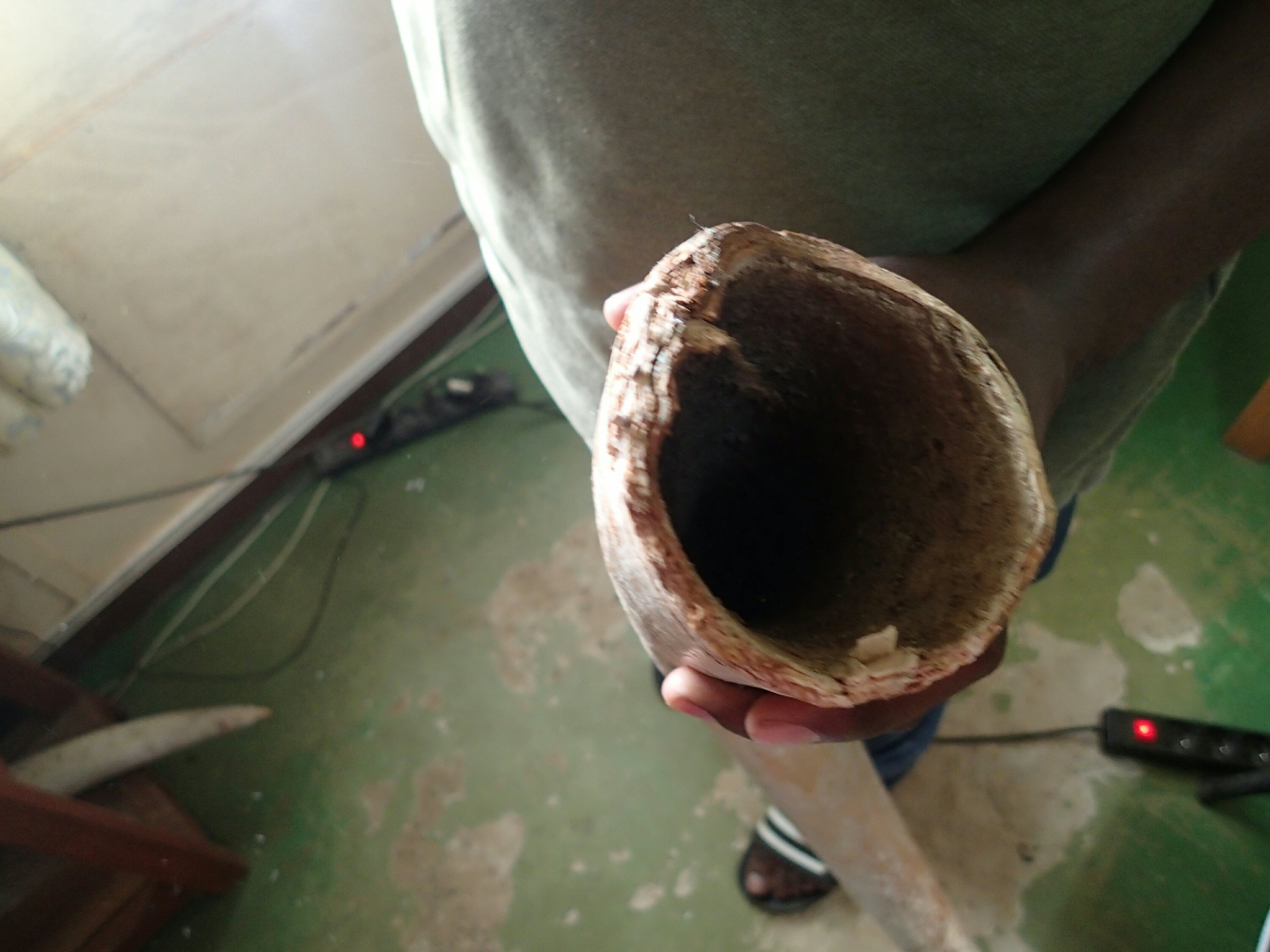 象牙はズッシリと重い。これは20kgぐらいだけど、アフリカ象は最大で3m、100kgぐらいになるらしい!!人間の歯と同じように中は空洞だった。